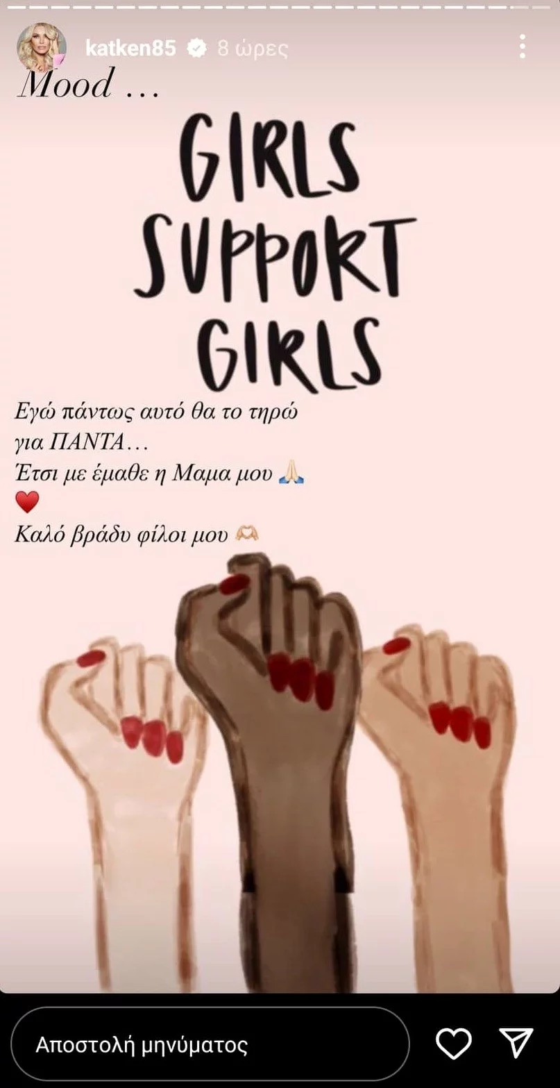Στη συνέχεια η παρουσιάστρια αναδημοσίευσε ακόμα ένα story, με μήνυμα που αναφερόταν στη Σοφία Μουτίδου, ενώ λίγο αργότερα δημοσιεύοντας ακόμη ένα στιγμιότυπο που έγραφε: «Τα κορίτσια στηρίζουν τα κορίτσια. Εγώ πάντως αυτό θα το τηρώ για ΠΑΝΤΑ. Έτσι με έμαθε η μαμά μου. Καλό βράδυ φίλοι μου».