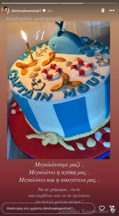 Η Δήμητρα Αλεξανδράκη λοιπόν μοιράστηκε με τους ακολούθους της στο Instagram την τούρτα- έκπληξη, που του είχε ετοιμάσει για 41 του χρόνια, συνοδεύοντάς την με ένα τρυφερό κείμενο.