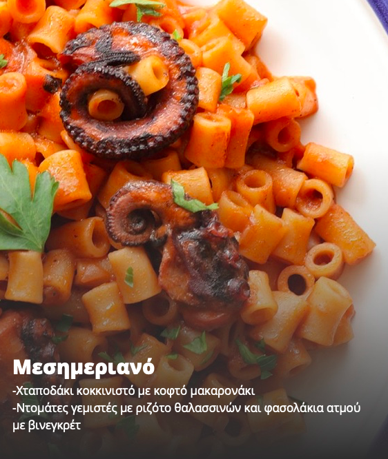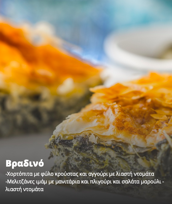 Περιλαμβάνει μία μεγάλη γκάμα γεύσεων, όπως όσπρια, λαδερά, ψάρια και θαλασσινά. Το συγκεκριμένο μενού προτείνεται σαν εναλλακτική λύση μόνο για τις δύο μεγάλες περιόδους νηστείας, δηλαδή την Σαρακοστή (Πάσχα) και τα Χριστούγεννα.