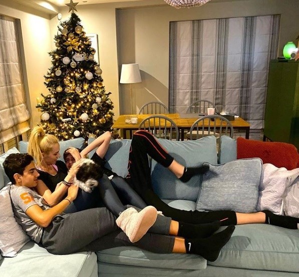 Η ίδια μοιράστηκε με τους διαδικτυακούς της φίλους μια άκρως τρυφερή φωτογραφία της αγκαλιά με τα παιδιά της και τον σκύλο τους στον καναπέ τους ενώ πίσω του είναι στολισμένο ένα υπέροχο Χριστουγεννιάτικο δέντρο.