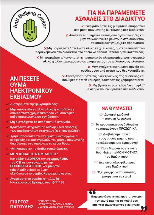 Με πρωτοβουλία του Περιφερειάρχη Αττικής Γ. Πατούλη ξεκίνησε η Δράση ενημέρωσης των νέων σχετικά με τον κίνδυνο εκφοβισμού μέσω του Διαδικτύου αλλά και την καινοτόμα εφαρμογή ABC (Anti Bullying Center) που δημιουργήθηκε σε συνεργασία της Περιφέρειας Αττικής με το CSI Ιnstitute.