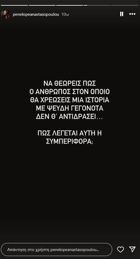 Ενώ η Πηνελόπη Αναστασοπούλου γράφει: «Να θεωρείς ότι ο άνθρωπος στον οποίο θα χρεώσεις μια ιστορία με ψευδή γεγονότα, δε θα αντιδράσει. Πως λέγεται αυτή η συμπεριφορά;»