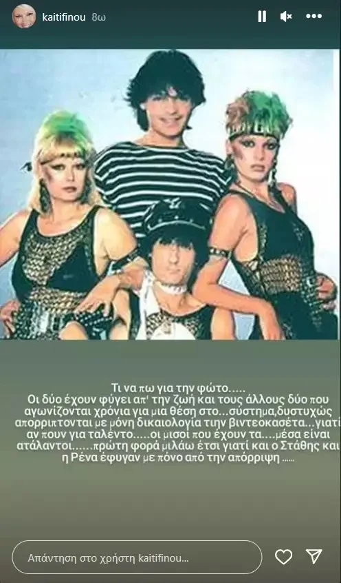 «Τι να πω για την φώτο… Οι δύο έχουν φύγει απ’ την ζωή και τους άλλους δύο που αγωνίζονται χρόνια για μια θέση στο… σύστημα, δυστυχώς απορρίπτονται με μόνη δικαιολογία τη βιντεοκασέτα… γιατί αν πουν για ταλέντο.. οι μισοί που έχουν τα μέσα είναι ατάλαντοι… πρώτη φορά μιλάω έτσι γιατί και ο Στάθης και η Ρένα έφυγαν με πόνο από την απόρριψη», έγραψε χαρακτηριστικά η Καίτη Φίνου, αφήνοντας σαφή υπονοοούμενα.