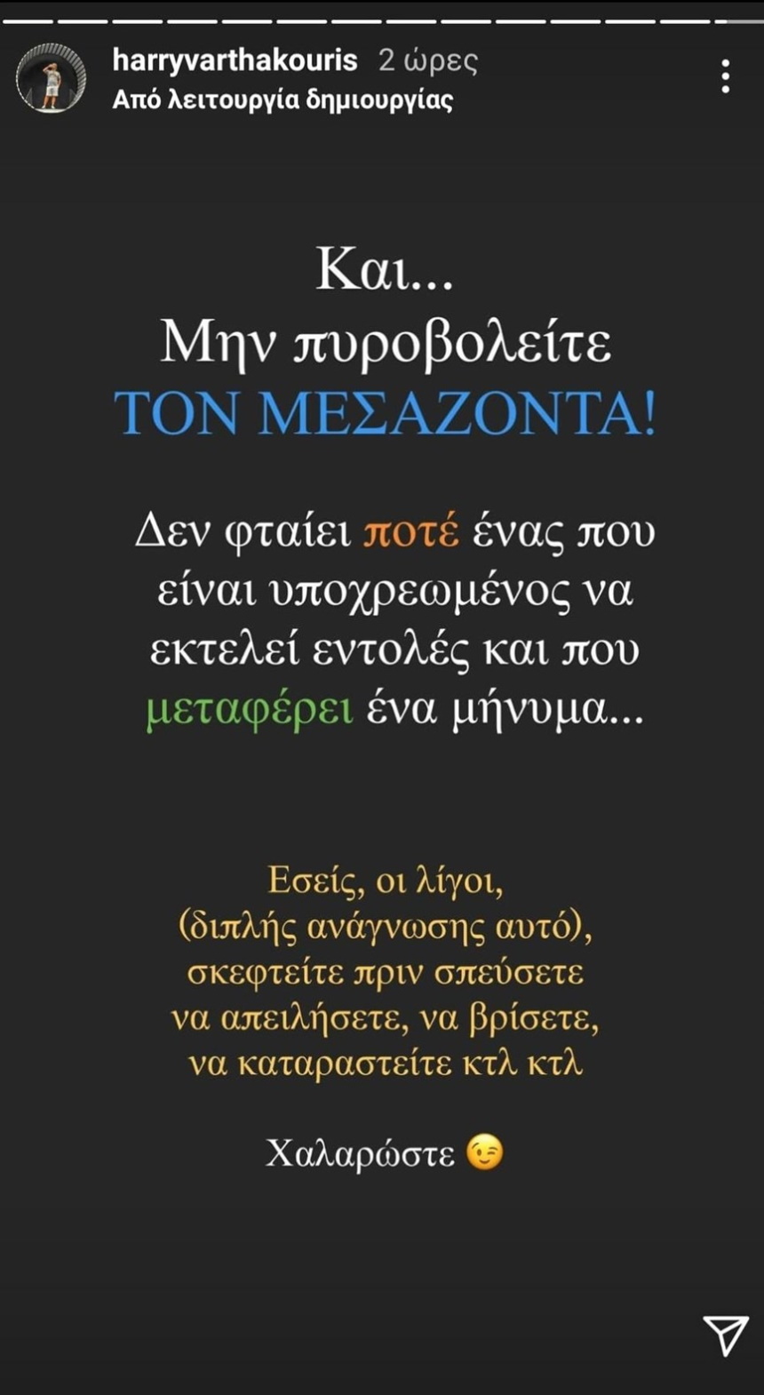 «Και… μην πυροβολείτε τον μεσάζοντα. Δεν φταίει ποτέ ένας που είναι υποχρεωμένος να εκτελεί εντολές και που μεταφέρει ένα μήνυμα. Εσείς οι λίγοι (διπλής ανάγνωσης αυτό), σκεφτείτε πριν σπεύσετε να απειλήσετε, να βρίσετε, να καταραστείτε κτλ κτλ. Χαλαρώστε»