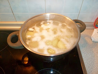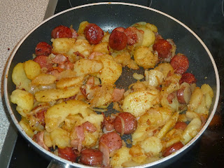 7) Αφού γίνουν οι πατάτες προσθέστε τα τσιγαρισμένα κρεμμύδια, λουκάνικα και μπέικον. Ανακατέψτε τα όλα μαζί και προσθέστε αλάτι και πάπρικα.