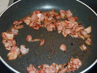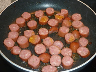 5) Βγάλτε τα κρεμμύδια από το τηγάνι και τσιγαρίστε το μπέικον μέχρι να αλλάξει χρώμα και μετά τα λουκάνικα. Αν χρειαστεί προσθέστε κι άλλο λάδι.
