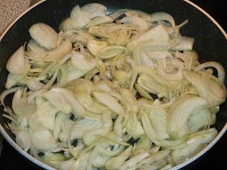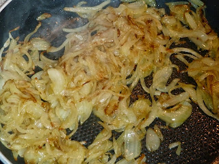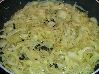 4) Βάλτε λάδι σε ένα μεγάλο τηγάνι και τσιγαρίστε τα κρεμμύδια μέχρι να πάρουν ένα χρυσαφί χρώμα.