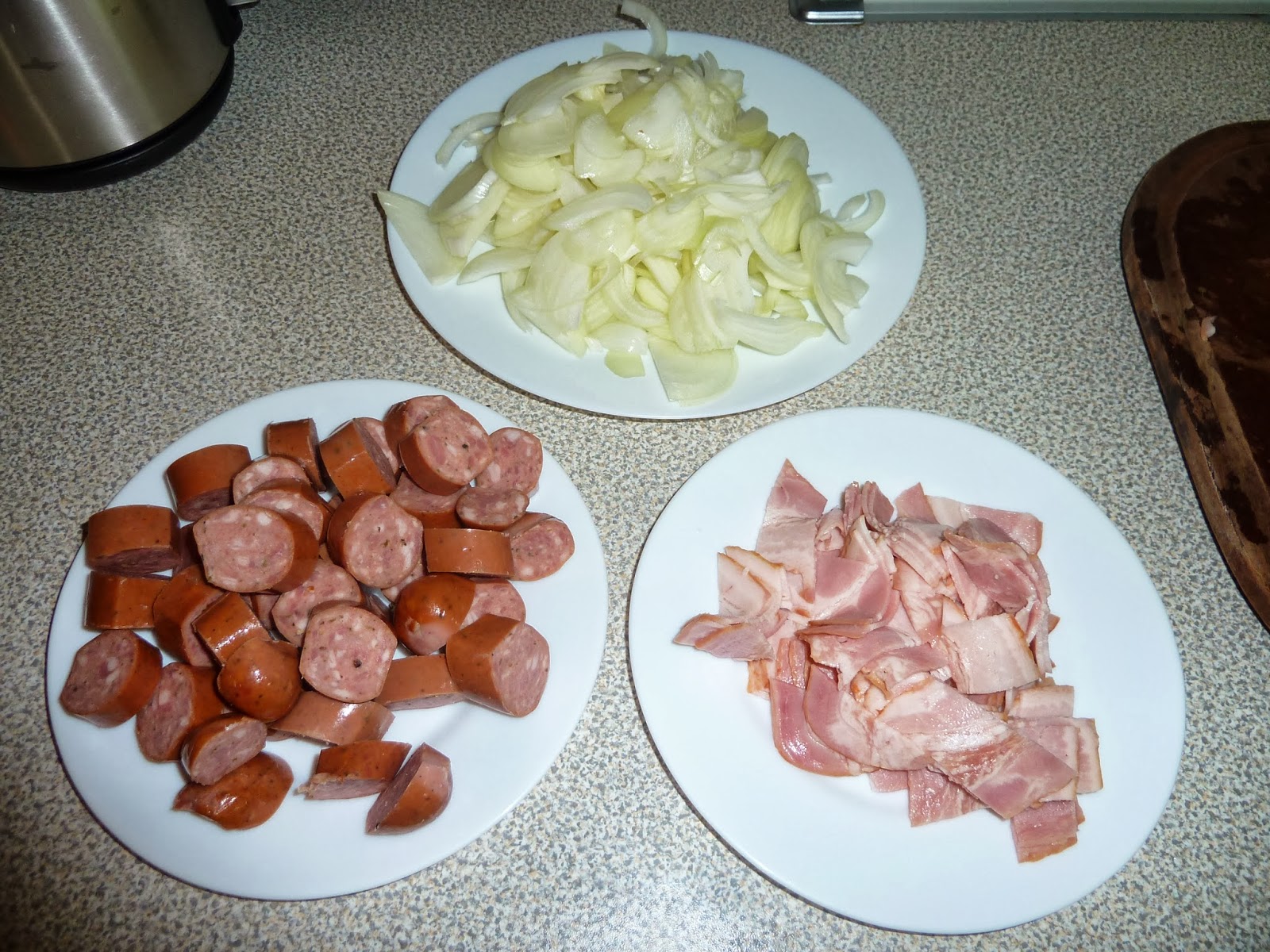 3) Καθαρίστε και κόψτε το κρεμμύδι σε λεπτές φέτες. Κόψτε τα λουκάνικα και το μπέικον σε μπουκιές.