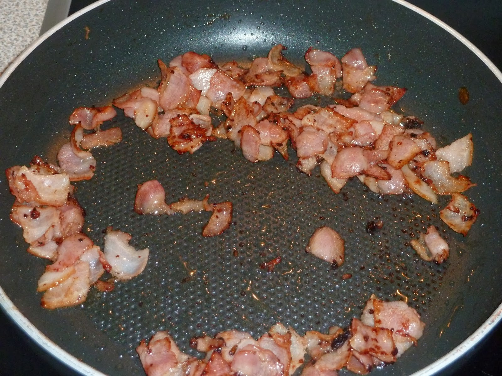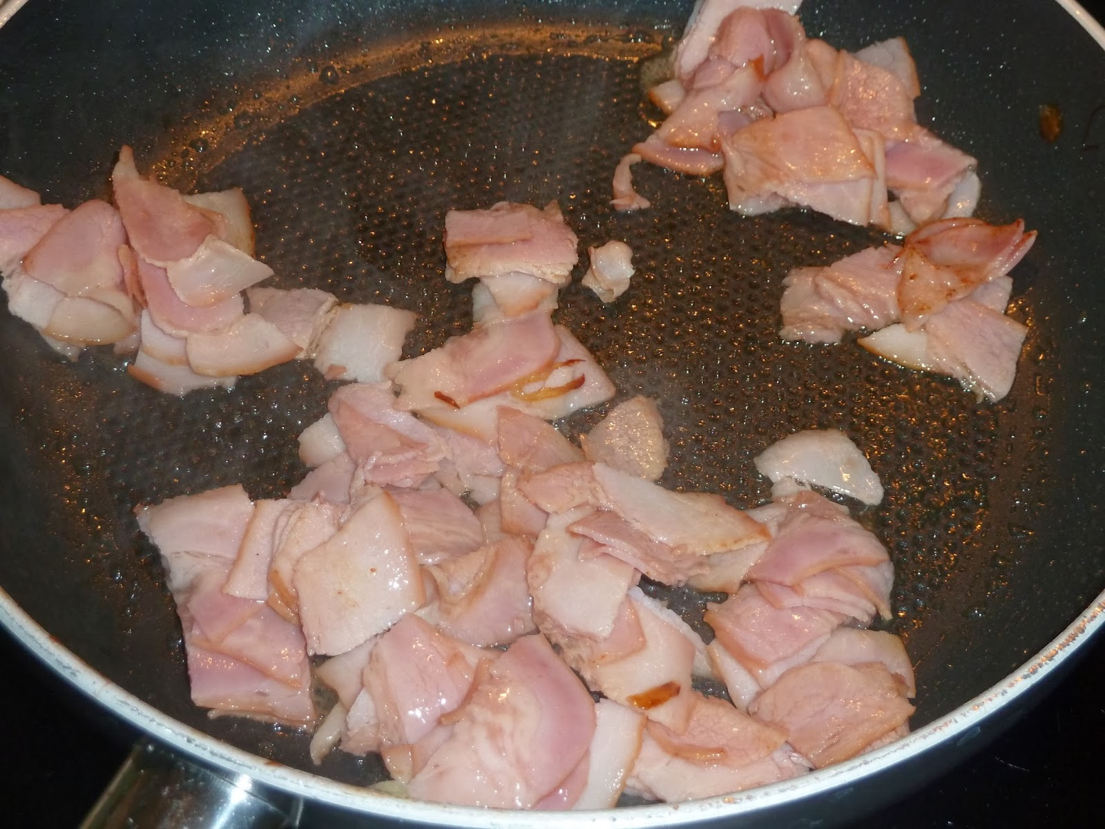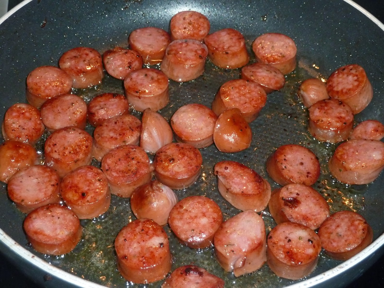 5) Βγάλτε τα κρεμμύδια από το τηγάνι και τσιγαρίστε το μπέικον μέχρι να αλλάξει χρώμα και μετά τα λουκάνικα. Αν χρειαστεί προσθέστε κι άλλο λάδι.