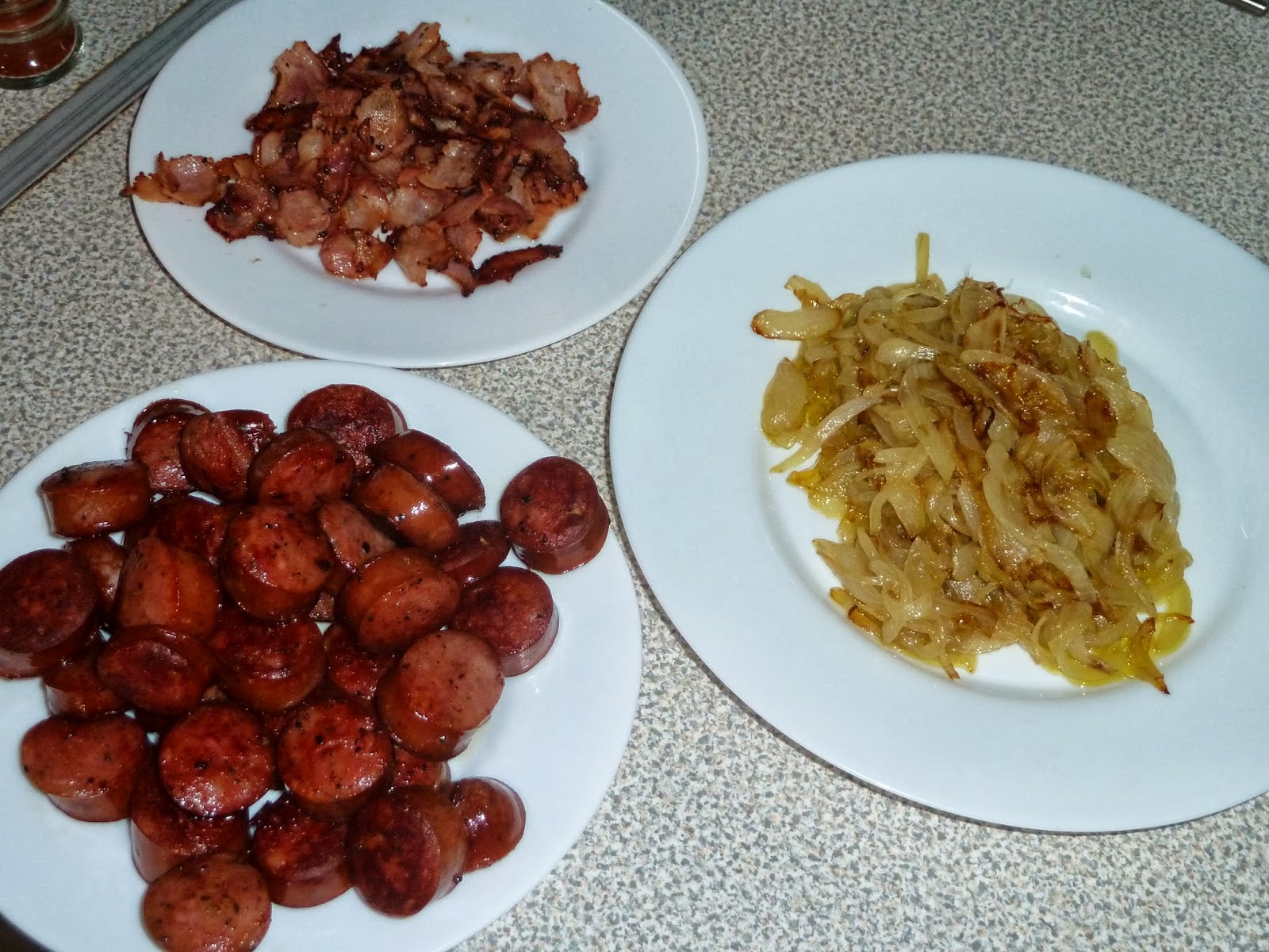 7) Αφού γίνουν οι πατάτες προσθέστε τα τσιγαρισμένα κρεμμύδια, λουκάνικα και μπέικον. Ανακατέψτε τα όλα μαζί και προσθέστε αλάτι και πάπρικα.
