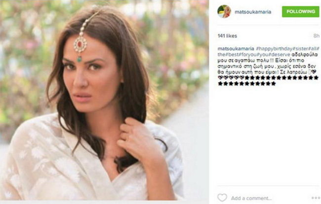 Ένα από τα πιο αγαπημένα της πρόσωπα της έστειλε πρώτο πρώτο τις θερμότερες ευχές στο Instagram! Δεν ήταν άλλη από τη νιόπαντρης αδερφή της Μαρία Ματσούκα. H τραγουδίστρια δημοσίευσε φωτογραφία γράφοντας χαρακτηριστικά: «Αδελφούλα μου σε αγαπάω πολύ. Είσαι ό,τι πιο σημαντικό στη ζωή μου, χωρίς εσένα δεν θα ήμουν αυτή που είμαι. Σε λατρεύω».