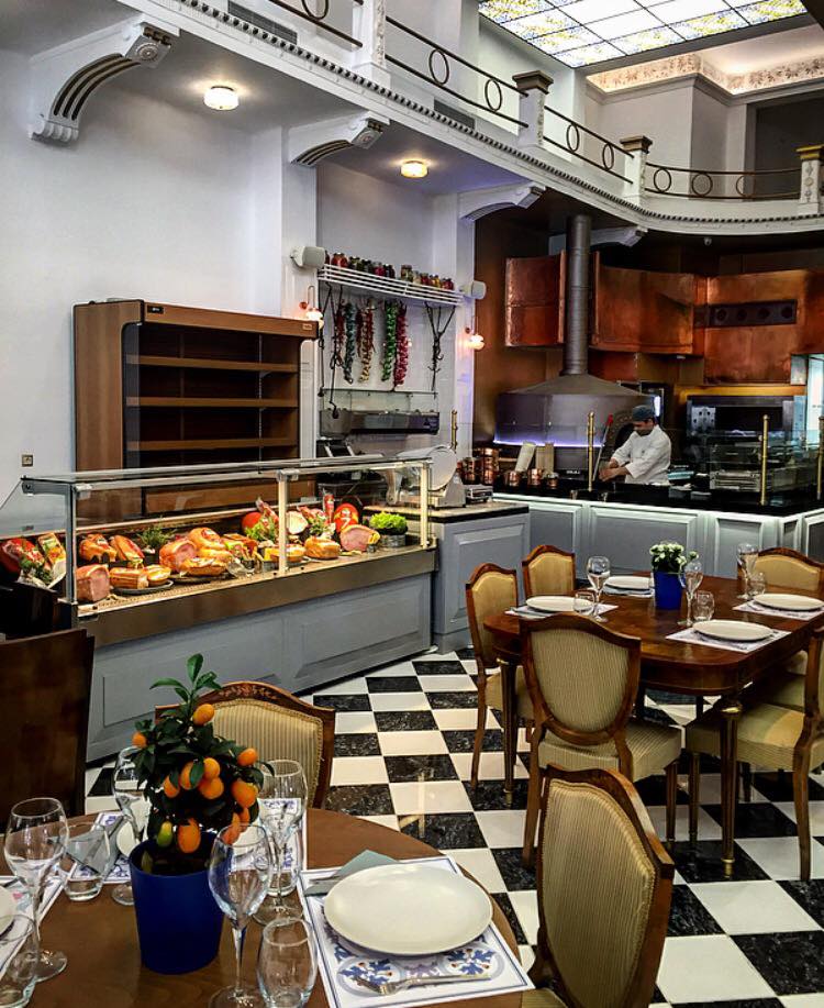 Το εστιατόριο λούζεται από φυσικό φως, με χαρακτηριστικό το vintage πλακάκι- σκακιέρα και τα εντυπωσιακά βιτρό που το κάνουν να μοιάζει βγαλμένο από μίαν άλλη εποχή, ενώ το βλέμμα κεντρίζει η τεράστια ανοιχτή κουζίνα ντυμένη με μπρούντζο, ο ξυλόφουρνος και το ψυγείο με τα αλλαντικά.