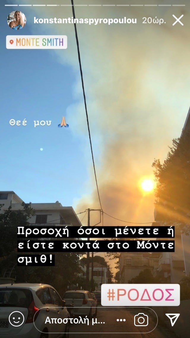 Φωτιά και στη Ρόδο. Η Κωνσταντίνα Σπυροπούλου μέσα από τον προσωπικό της λογαριασμό στο instagram ενημέρωσε τους διαδικτυακούς της φίλους με μία φωτογραφία για τη φωτιά που έπιασε στο νησί.