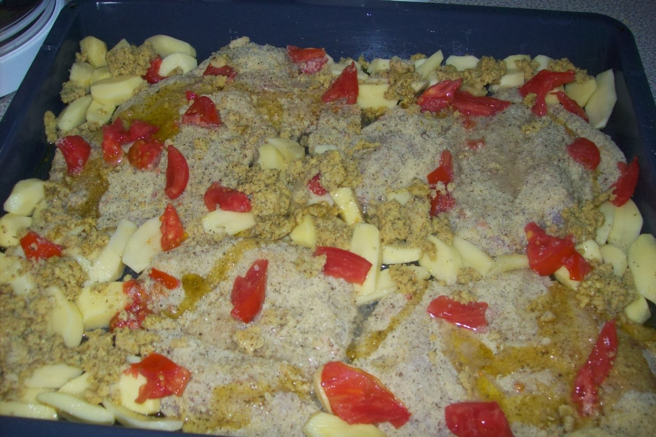 7) Προσθέστε τις πατάτες στο ταψί και αλατίστε τες καλά. Αν θέλετε μπορείτε και σε αυτές να βάλετε από τα μπαχαρικά.