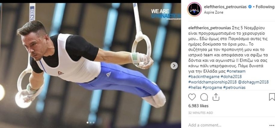 Στις 5 Νοεμβρίου είναι προγραμματισμένο το χειρουργείο μου… Εδώ όμως στο Παγκόσμιο αυτες τις ημέρες δοκίμασα τα όρια μου… Το συζήτησα με τον προπονητή μου και το ιατρικό team και αποφάσισα να σφίξω τα δόντια και να αγωνιστώ !! Ελπίζω να σας κάνω πάλι υπερήφανους. Πάμε δυνατά για την Ελλάδα μας #oneteam #backinthegame #doha2018 #worldchampionship2018 @dohagym2018 #hellas #progame #petrounias