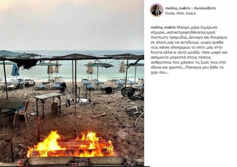 Μαύρη μέρα ξημέρωσε σήμερα…. καταστροφή, θάνατος, οργή. Ανείπωτη τραγωδία… Δύναμη και Κουράγιο σε όλους μας να αντέξουμε… νωρίς έμαθα πώς κάηκε ολοσχερώς το σπίτι μας στην Κινέτα, αλλά κι αυτό μοιάζει τόσο μικρό και ασήμαντο μπροστά στους τόσους ανθρώπους που χάσανε τις ζωές τους έτσι άδικα και φρικτά….. Παναγία μου βάλε το χέρι σου…