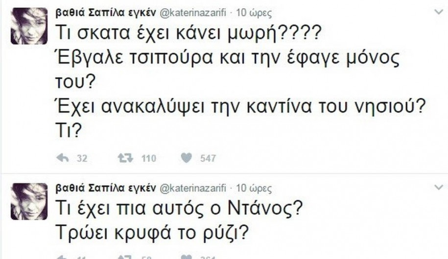 «Τι σκατά έχει κάνει μωρή???? Έβγαλε τσιπούρα και την έφαγε μόνος του? Έχει ανακαλύψει την καντίνα του νησιού? Τι? Τι έχει πια ο Ντάνος; Τρώει κρυφά το ρύζι;».