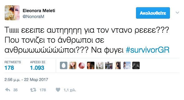 Η Κατερίνα Ζαρίφη παρακολουθώντας το ριάλιτι επιβίωσης έχει γράψει κατά καιρούς στο twitter: