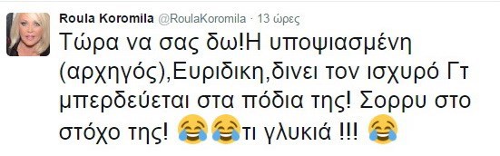 «Τώρα να σας δω! Η υποψιασμένη (αρχηγός),Ευρυδίκη, δίνει τον ισχυρό Γτ μπερδεύεται στα πόδια της! Σορρυ στο στόχο της! τι γλυκιά !!». Και συνέχισε: «Λοιπόν: παρακαλώ την παραγωγή αν κατέγραψαν πλάνα που αποδεικνύουν ότι ο Αγγελόπουλος είναι κακό παιδί, όπως λένε κάποιοι,να μας τα δείξουν».