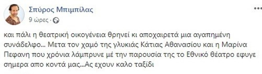 Και πάλι η θεατρική οικογένεια θρηνεί κι αποχαιρετά μια αγαπημένη συνάδελφο… Μετά τον χαμό της γλυκιάς Κάτιας Αθανασίου και η Μαρίνα Πεφάνη που χρόνια λάμπρυνε με την παρουσία της το Εθνικό θέατρο έφυγε σήμερα από κοντά μας… Ας έχουν καλό ταξίδι