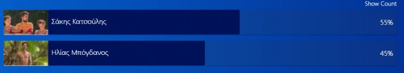 Σε ψηφοφορία επιπλέον του AthensMagazine.gr, ο Σάκης λαμβάνει ποσοστό 55% για να είναι ο νικητής του φετινού Survivor, ενώ ο Ηλίας 45%.