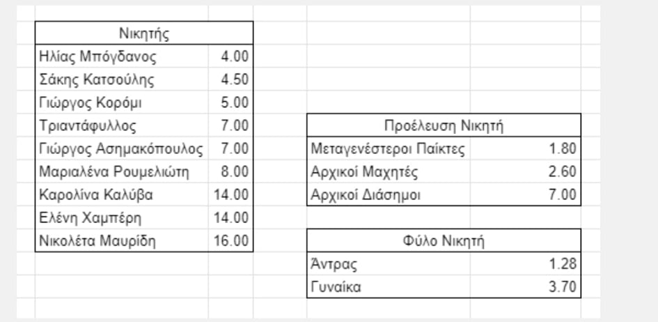 Σύμφωνα λοιπόν με τα γραφεία στοιχημάτων, εξακολουθεί να είναι στην 1η θέση ο Ηλίας Μπόγδανος, ενώ φαίνεται να απειλείται από τον Σάκη Κατσούλη, ο οποίος βρίσκεται σε απόσταση αναπνοής. Τους δύο άνδρες φαίνεται να απειλούν ο Γιώργος Κορόμι και ο Τριαντάφυλλος.