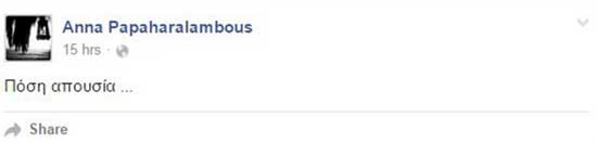 Η ηθοποιός συγκλονισμένη από τη μεγάλη απώλεια έγραψε στο Facebook «Πόση απουσία…», με τους διαδικτυακούς της φίλους να της στέλνουν την αγάπη τους και τη συμπαράστασή τους.
