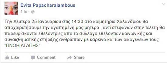 Την ίδια ώρα, η αδελφή της, pastry chef Εβίτα Παπαχαραλάμπους, ενημέρωσε μέσω του Facebook, για την κηδεία της μητέρας τους που θα γίνει τη Δευτέρα 25 Ιανουαρίου στο Κοιμητήριο Χαλανδρίου.