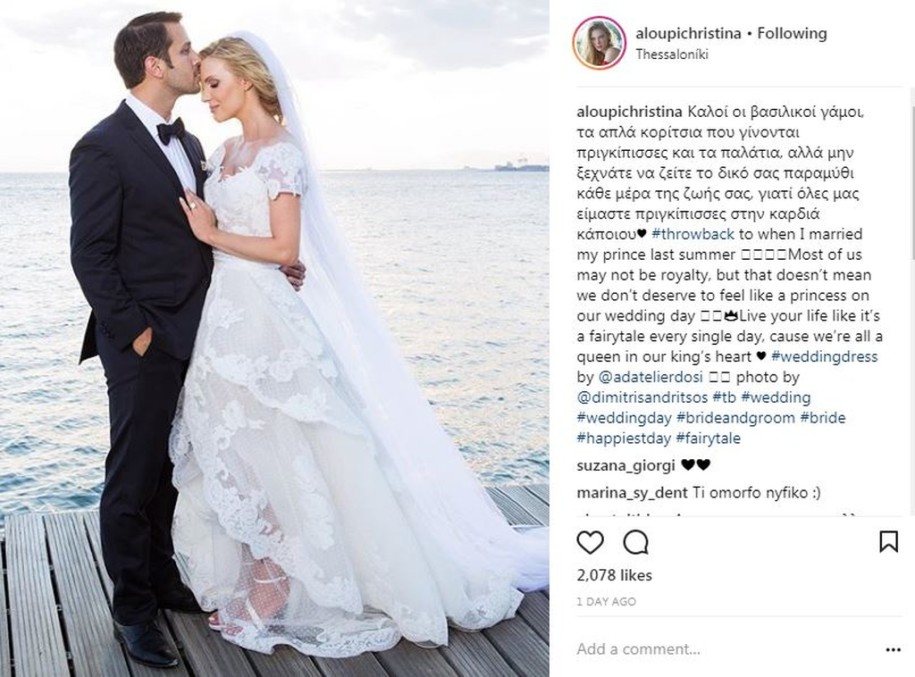 Πέρσι το καλοκαίρι παντρεύτηκε η Χριστίνα Αλούπη με τον Κώστα Κέφαλο. Η παρουσιάστρια ζει με την οικογένεια της στο Los Angeles και ανέβασε στο instagram μια φωτογραφία από την ημέρα του γάμου της με την λεζάντα: